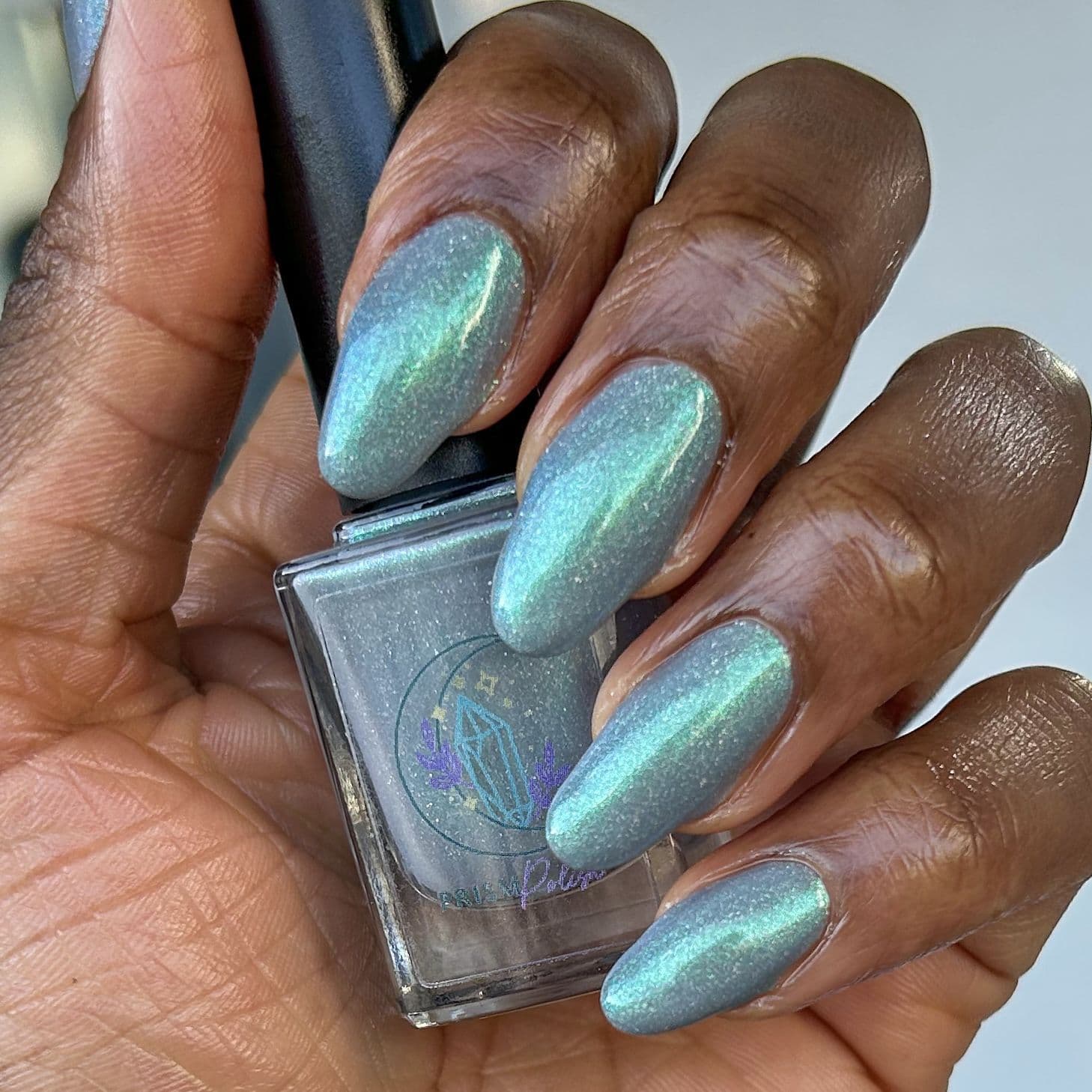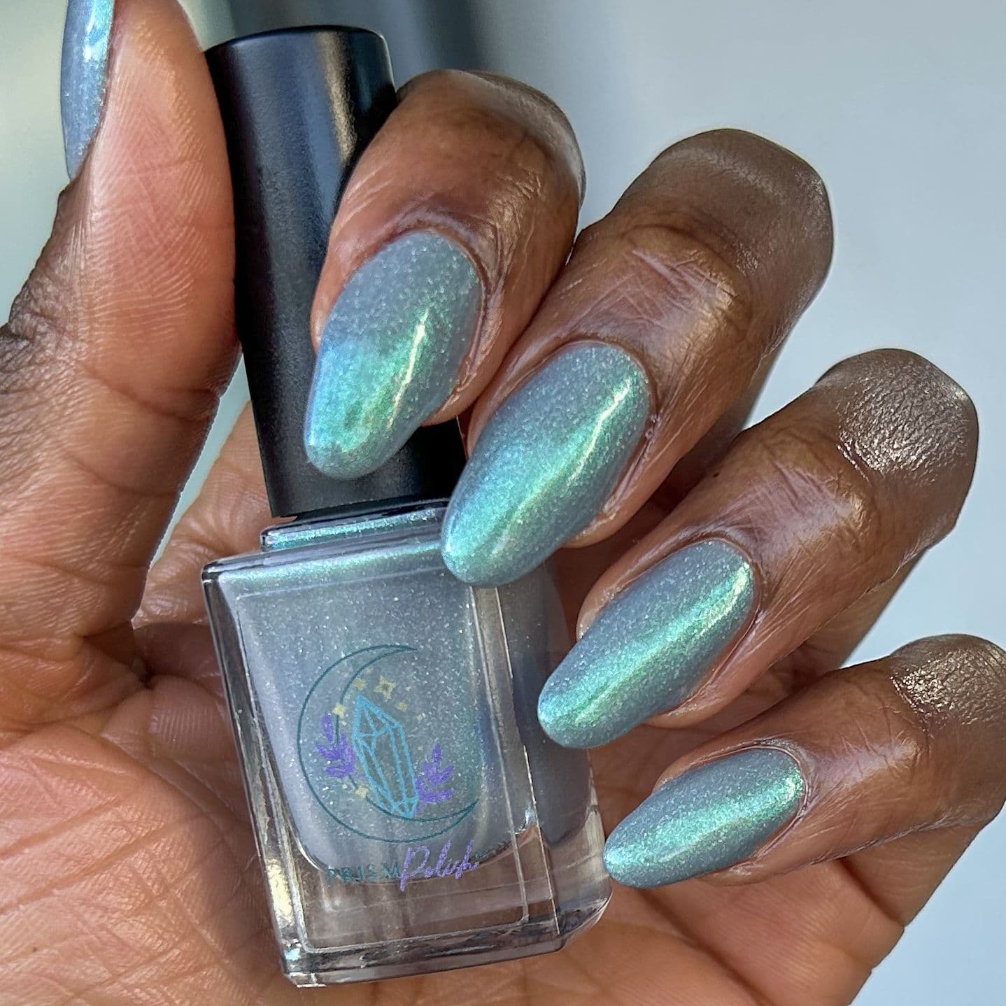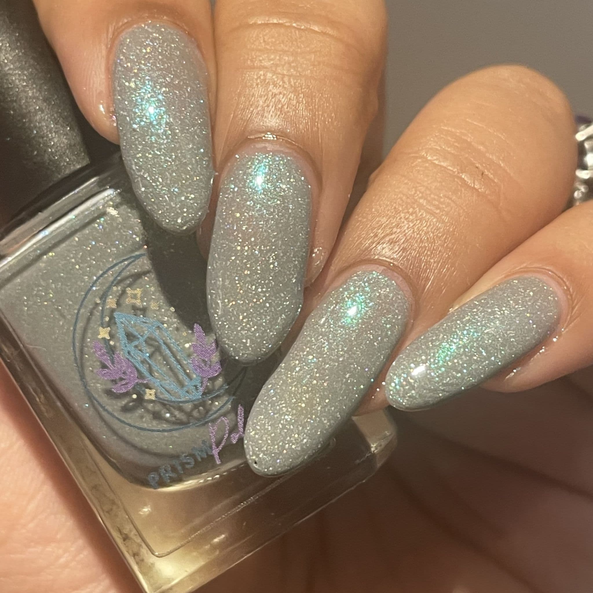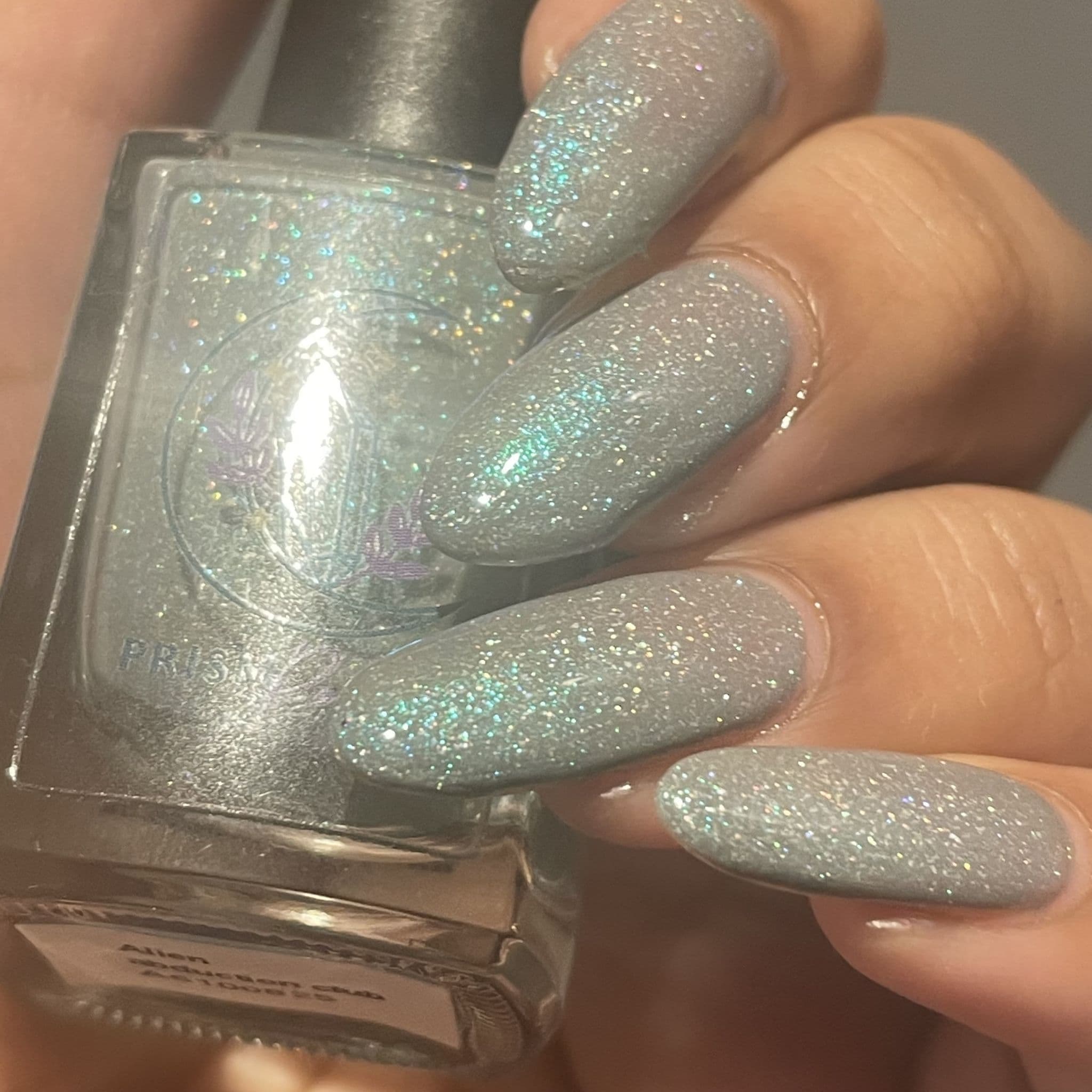 Step into the unknown with Alien abduction club, an eerie grey nail polish infused with green/bue/violet shifting shimmer and dazzling holographic flakies. This otherworldly shade captures the glow of UFO lights against a stormy night sky with a cosmic burst of holographic sparkle. Perfect for Sci-Fi nail art, or anyone who loves a supernatural twist on their nails!