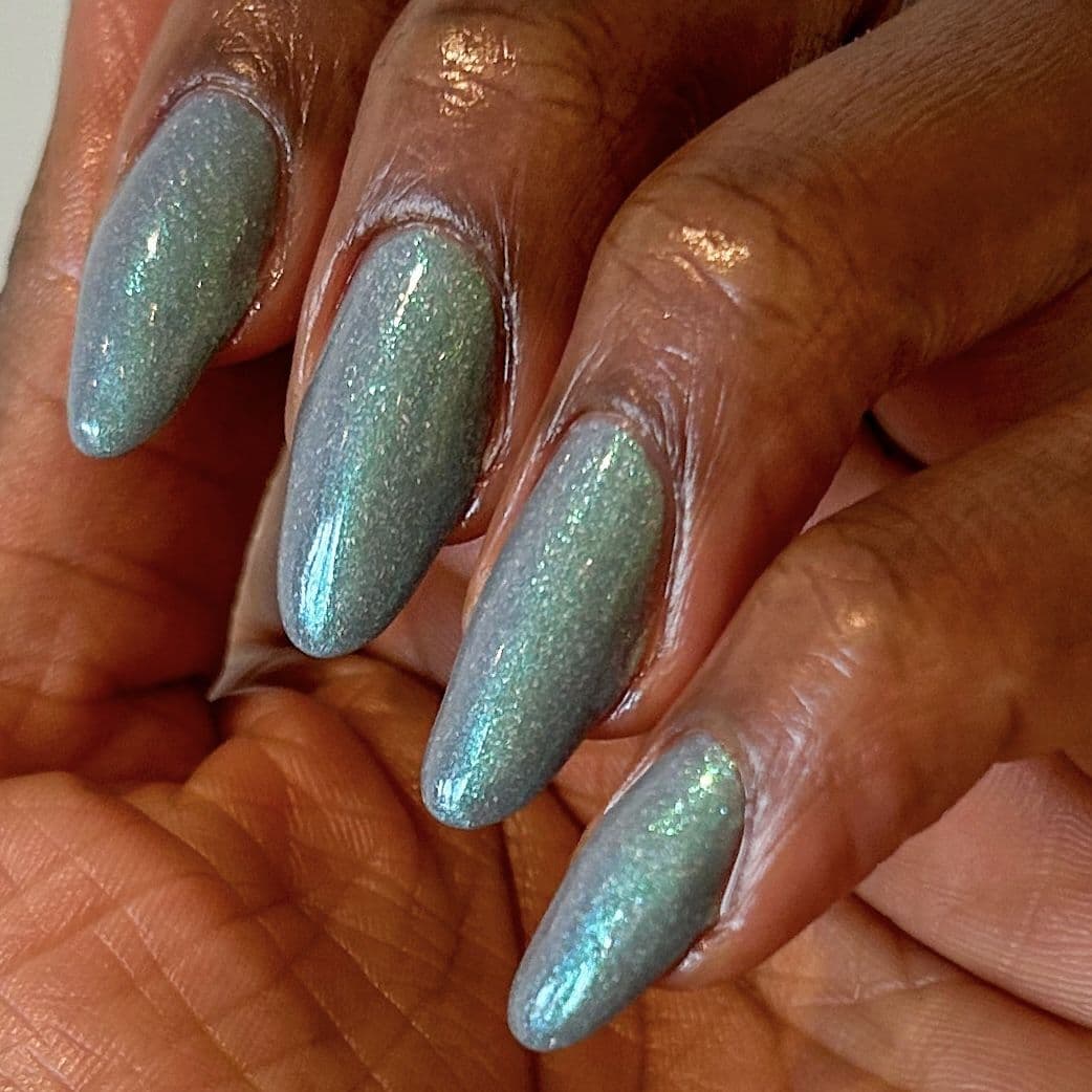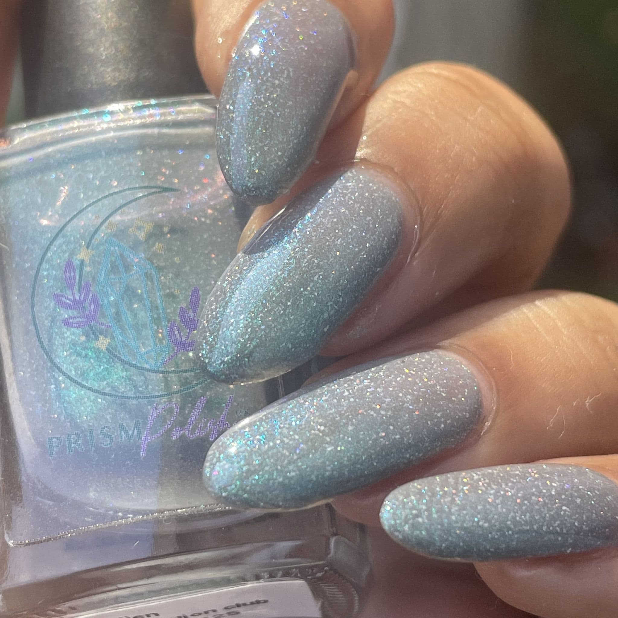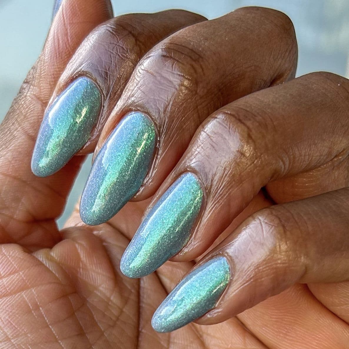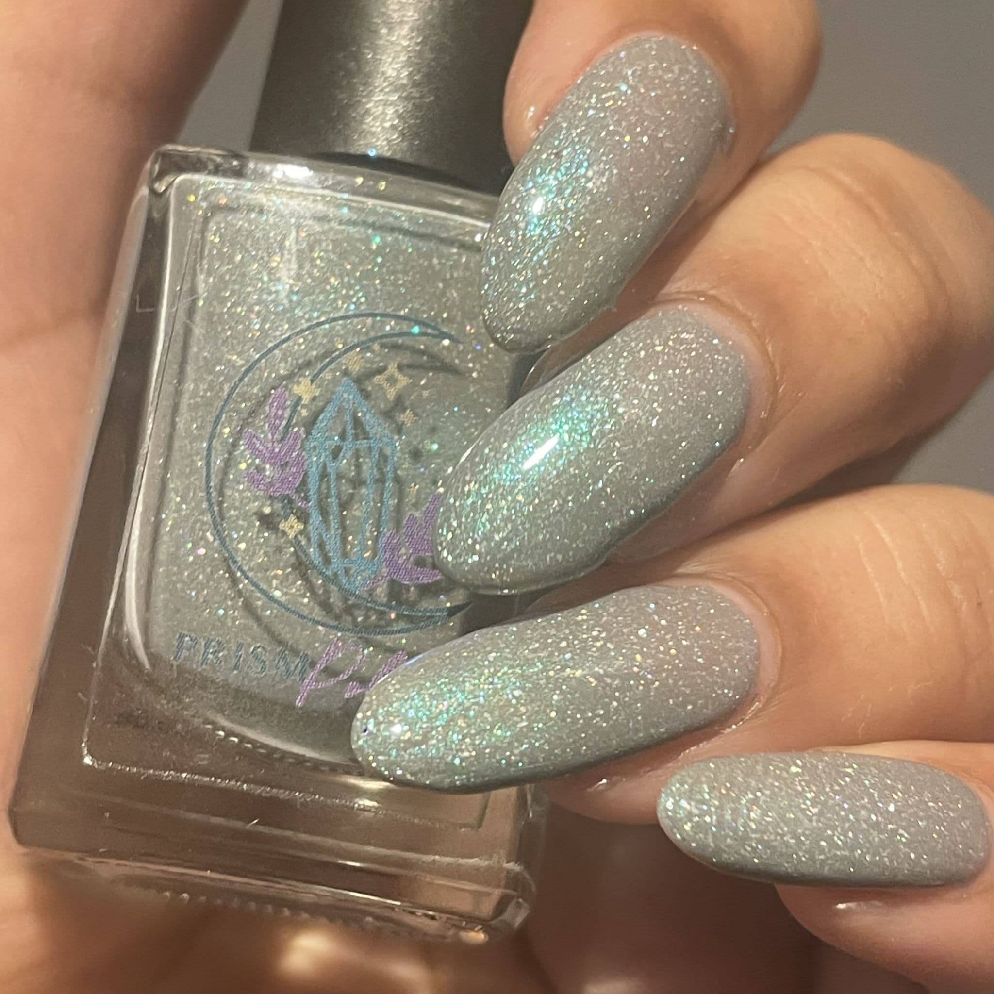 Step into the unknown with Alien abduction club, an eerie grey nail polish infused with green/bue/violet shifting shimmer and dazzling holographic flakies. This otherworldly shade captures the glow of UFO lights against a stormy night sky with a cosmic burst of holographic sparkle. Perfect for Sci-Fi nail art, or anyone who loves a supernatural twist on their nails!
