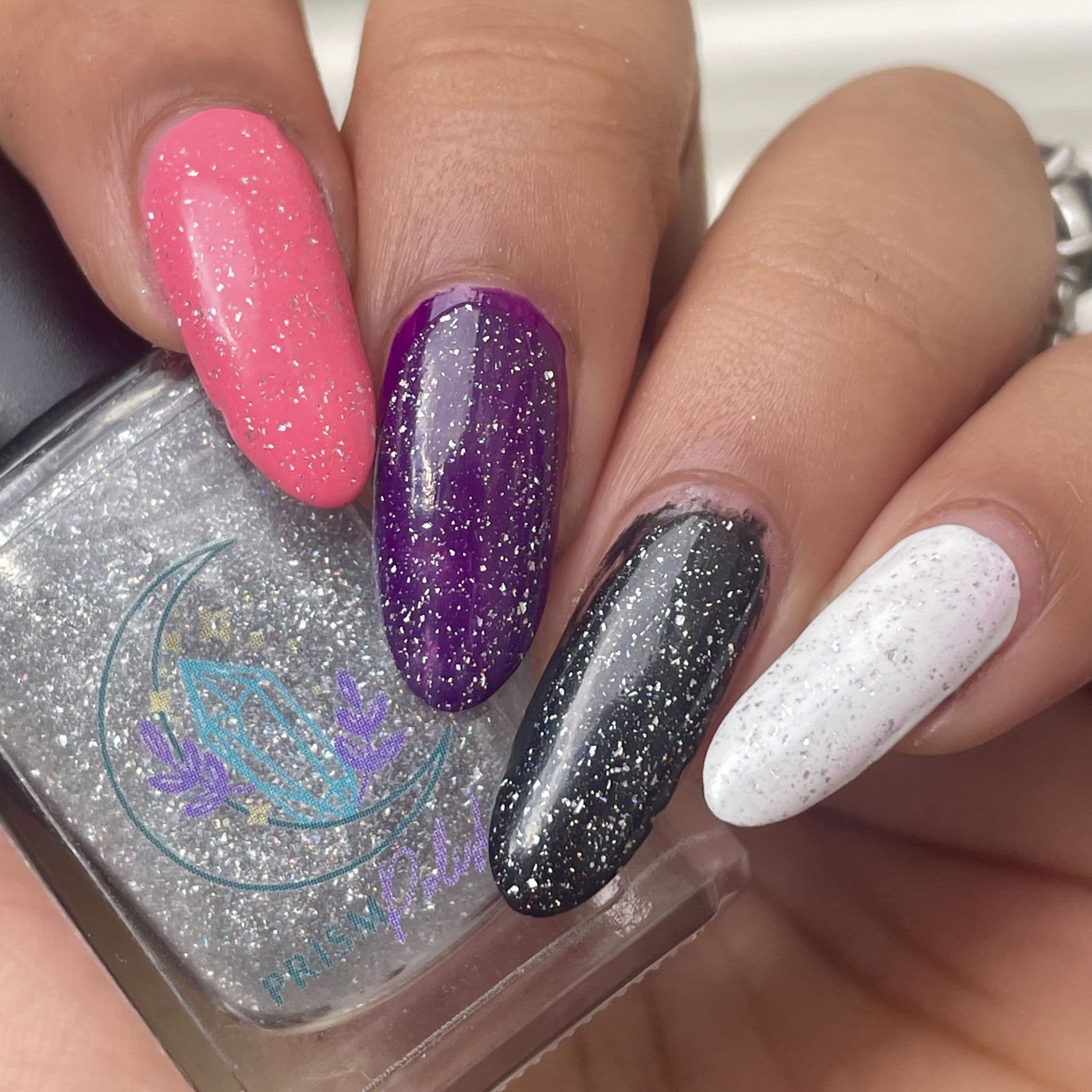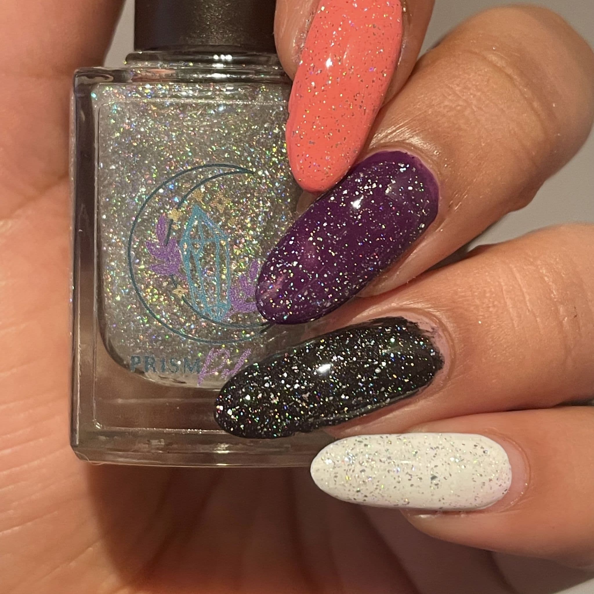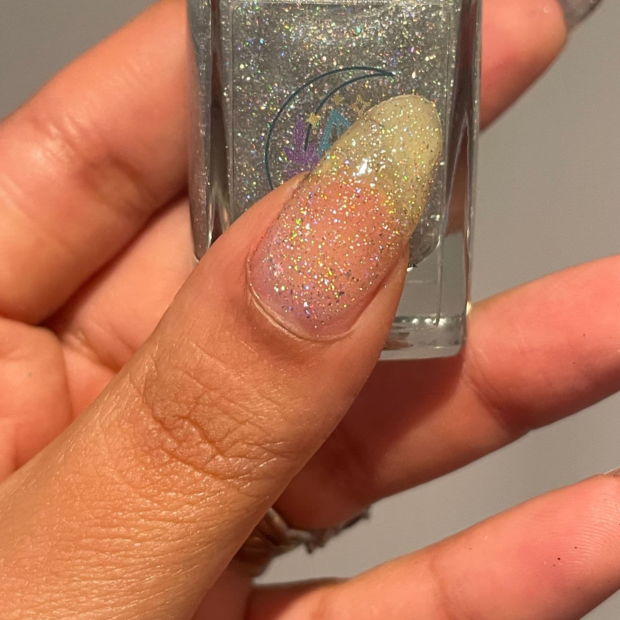 - Holographic topper with intense rainbow sparkle