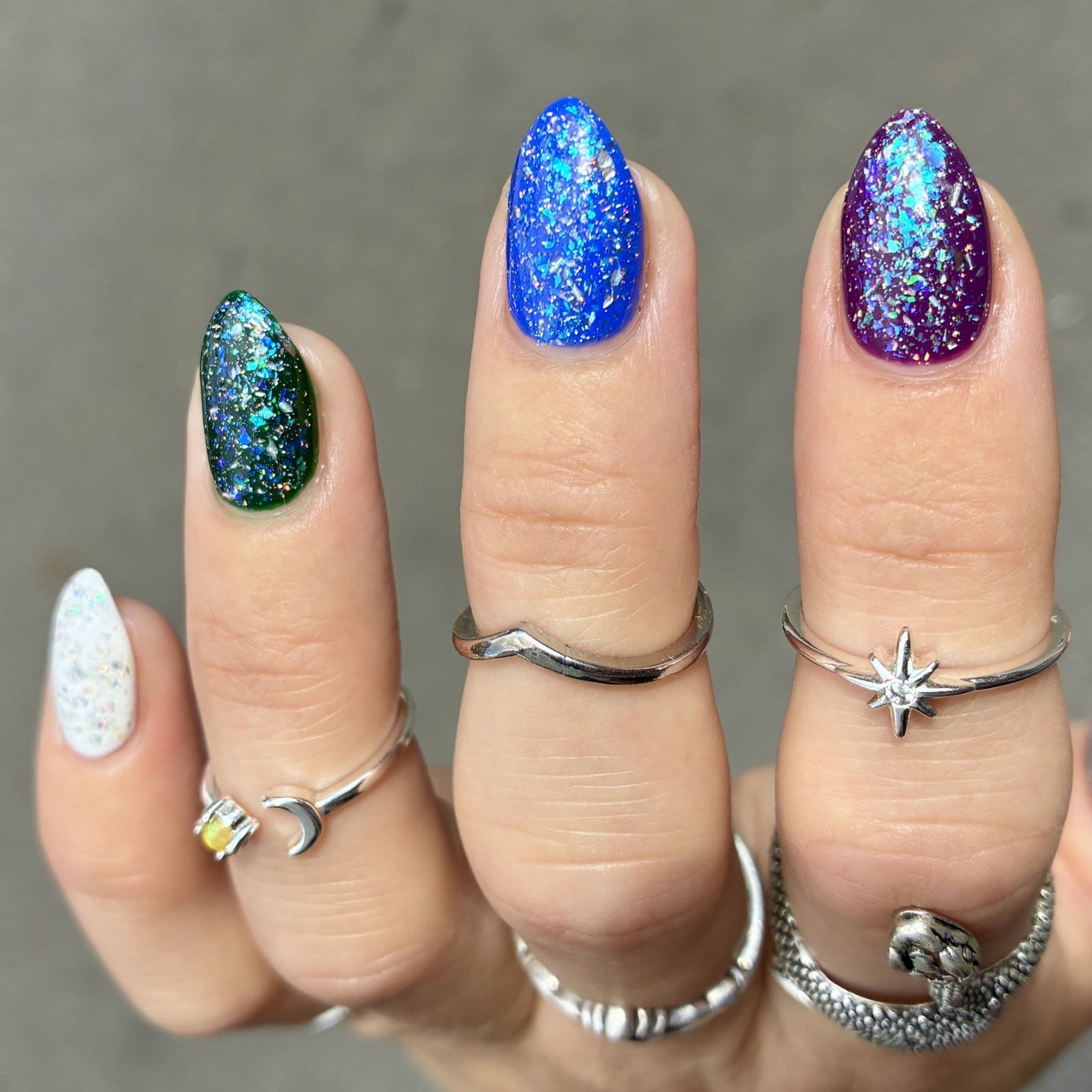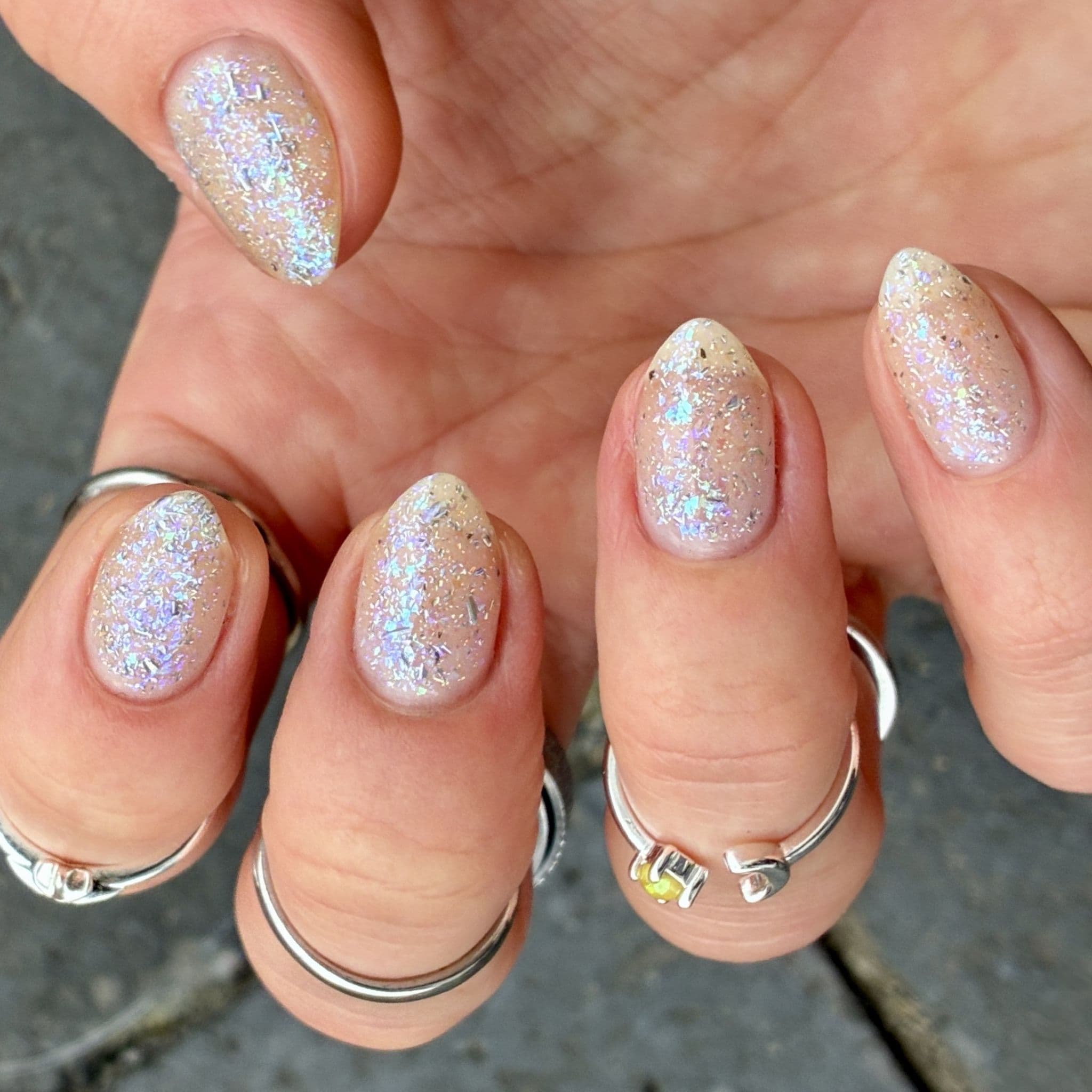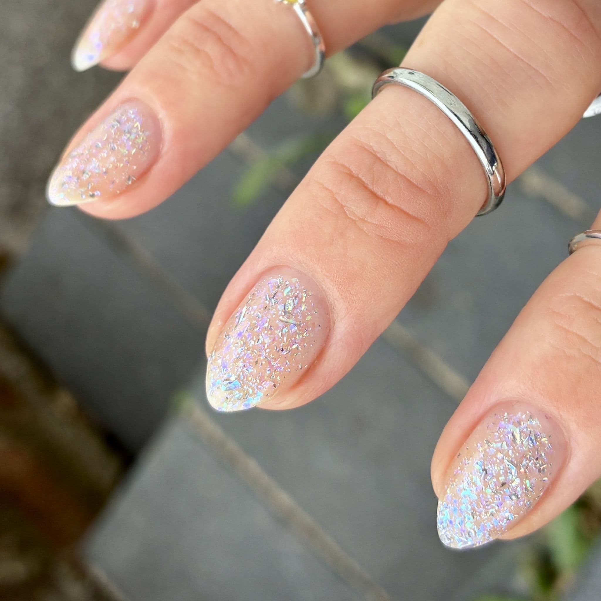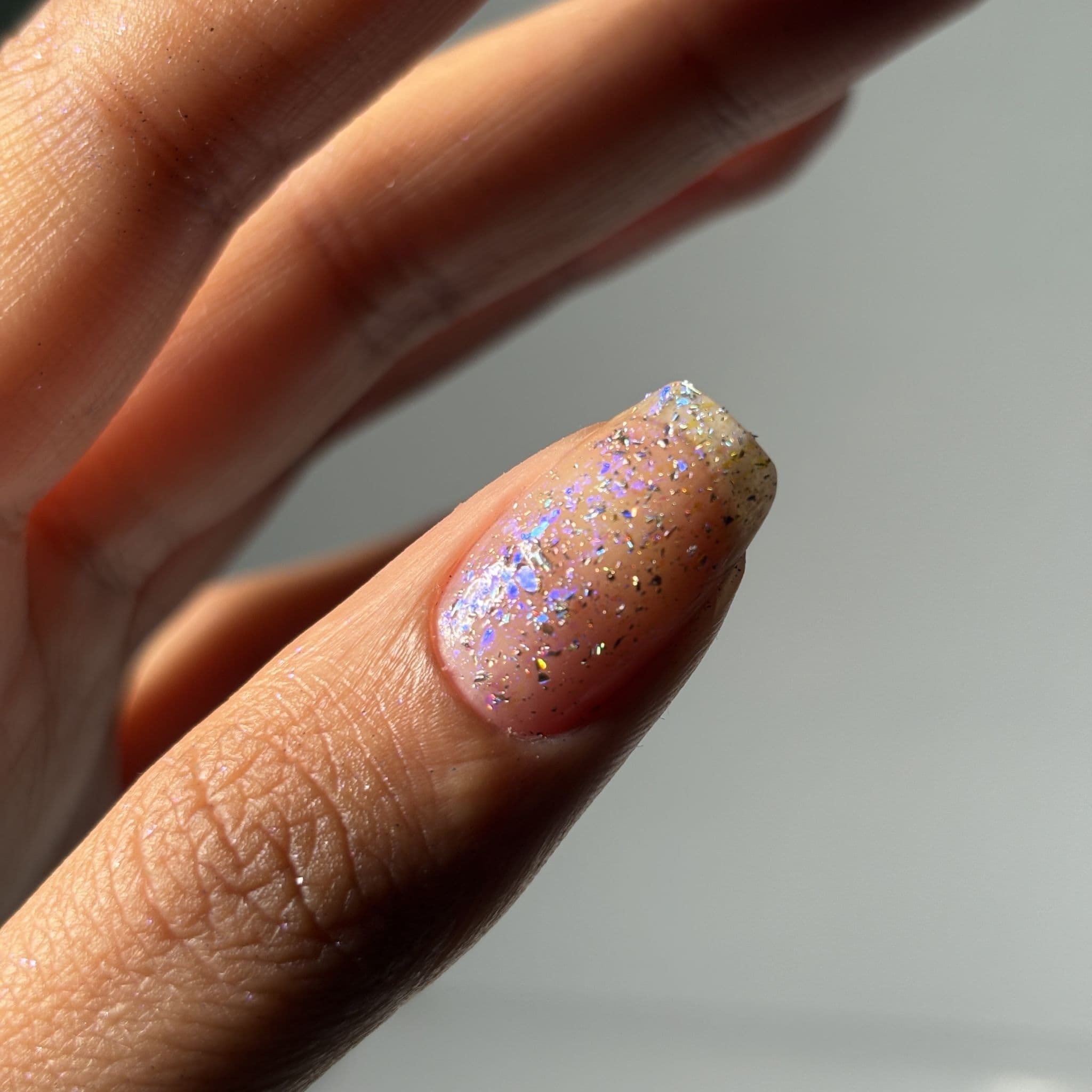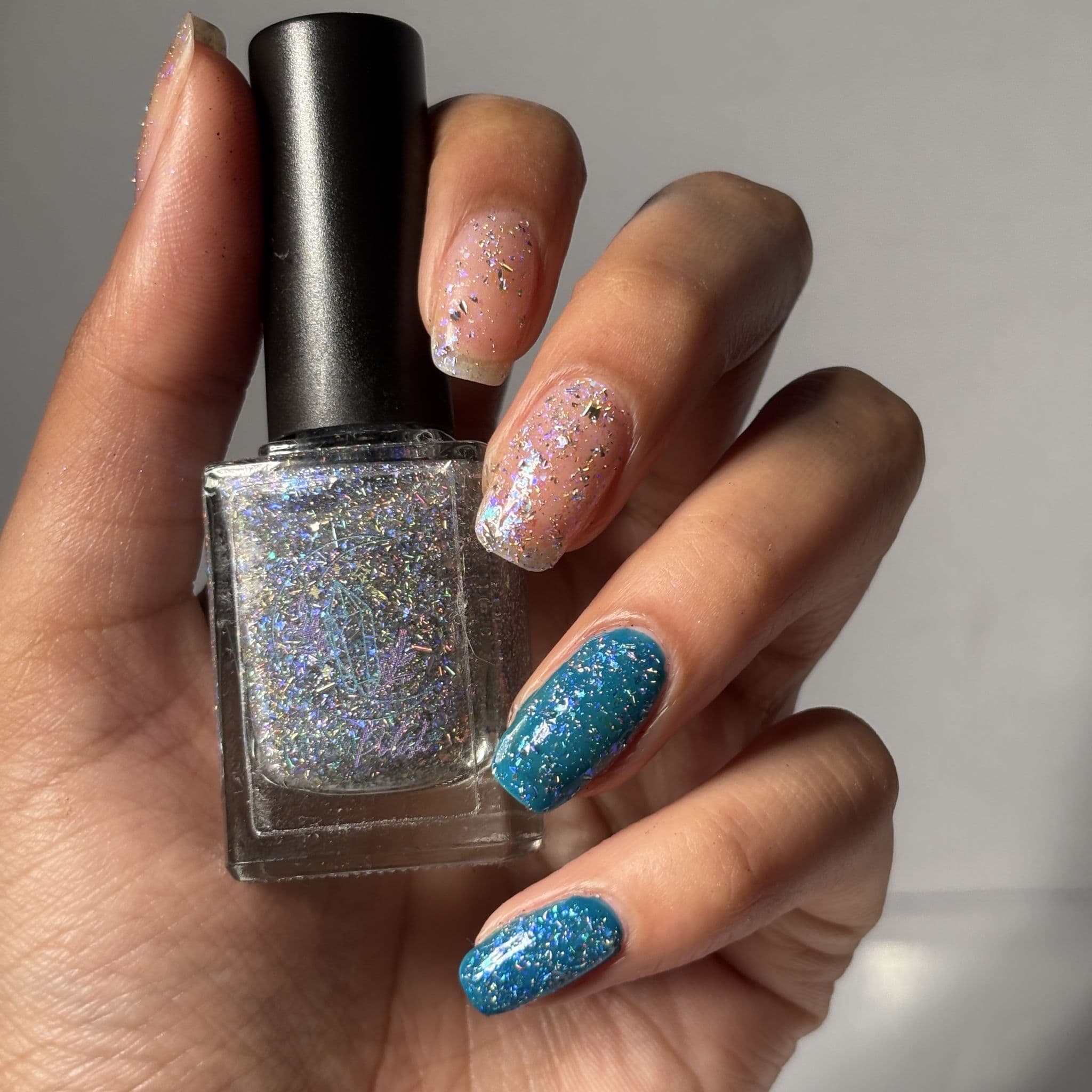 Named for the translucent Antarctic Icefish and originally released in the Summer of 2020 (cue lockdown flashbacks!) this turquoise/purple/blue shifting iridescent topper is also filled with holographic curls that look like bar glitter to add some extra sparkle to any mani!