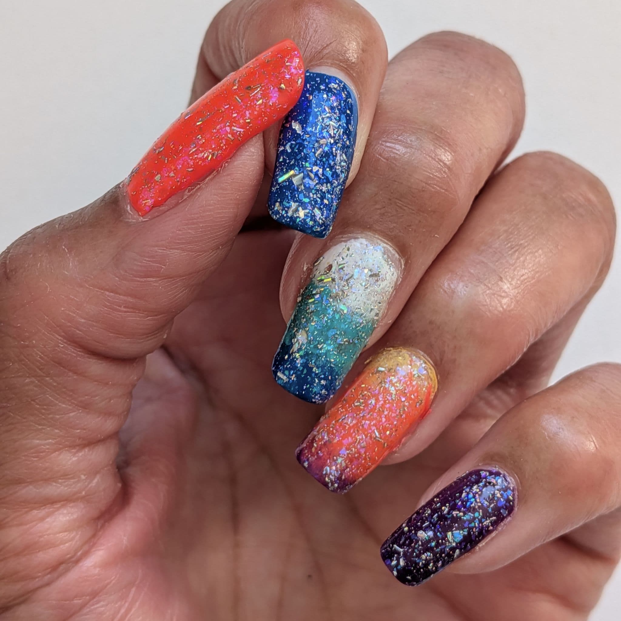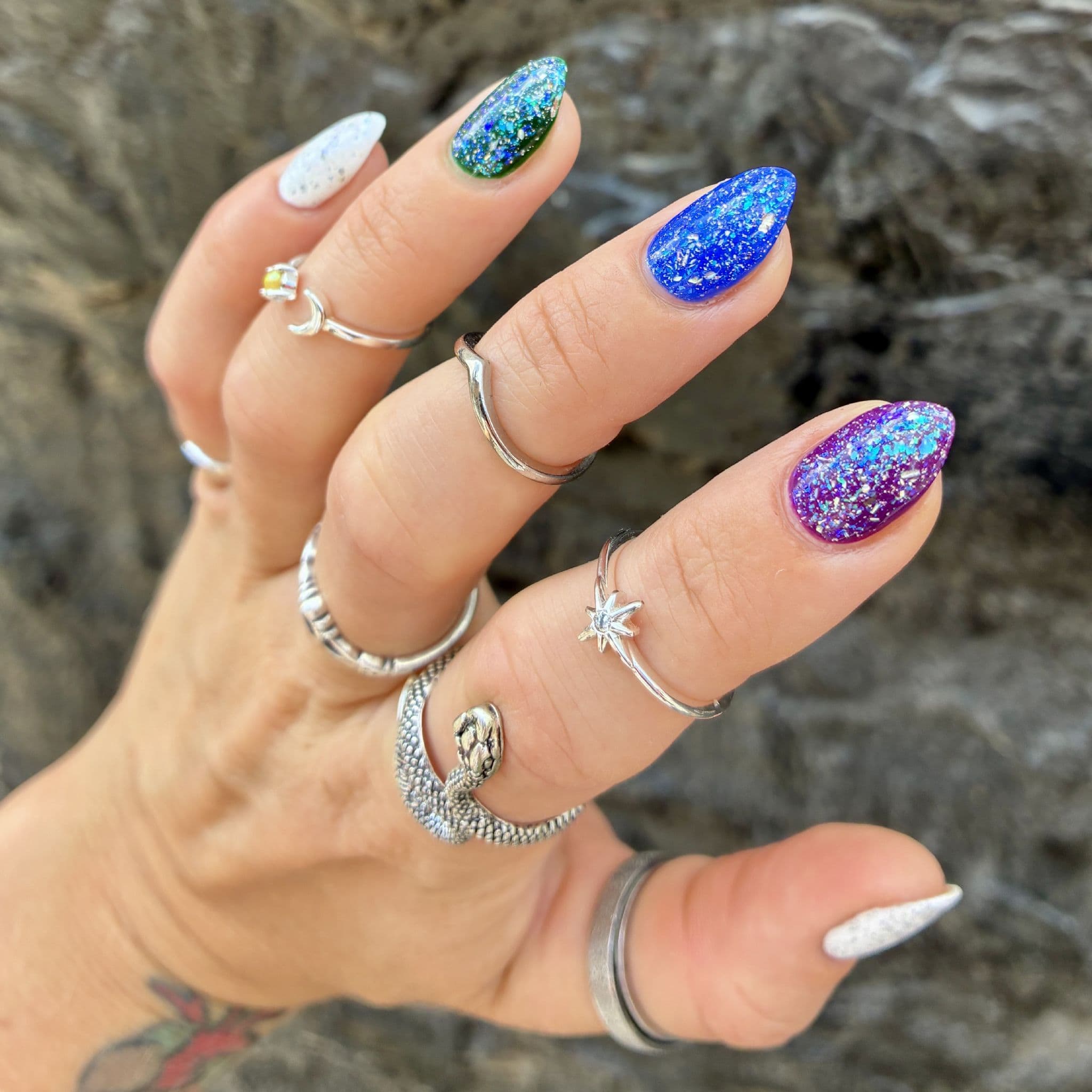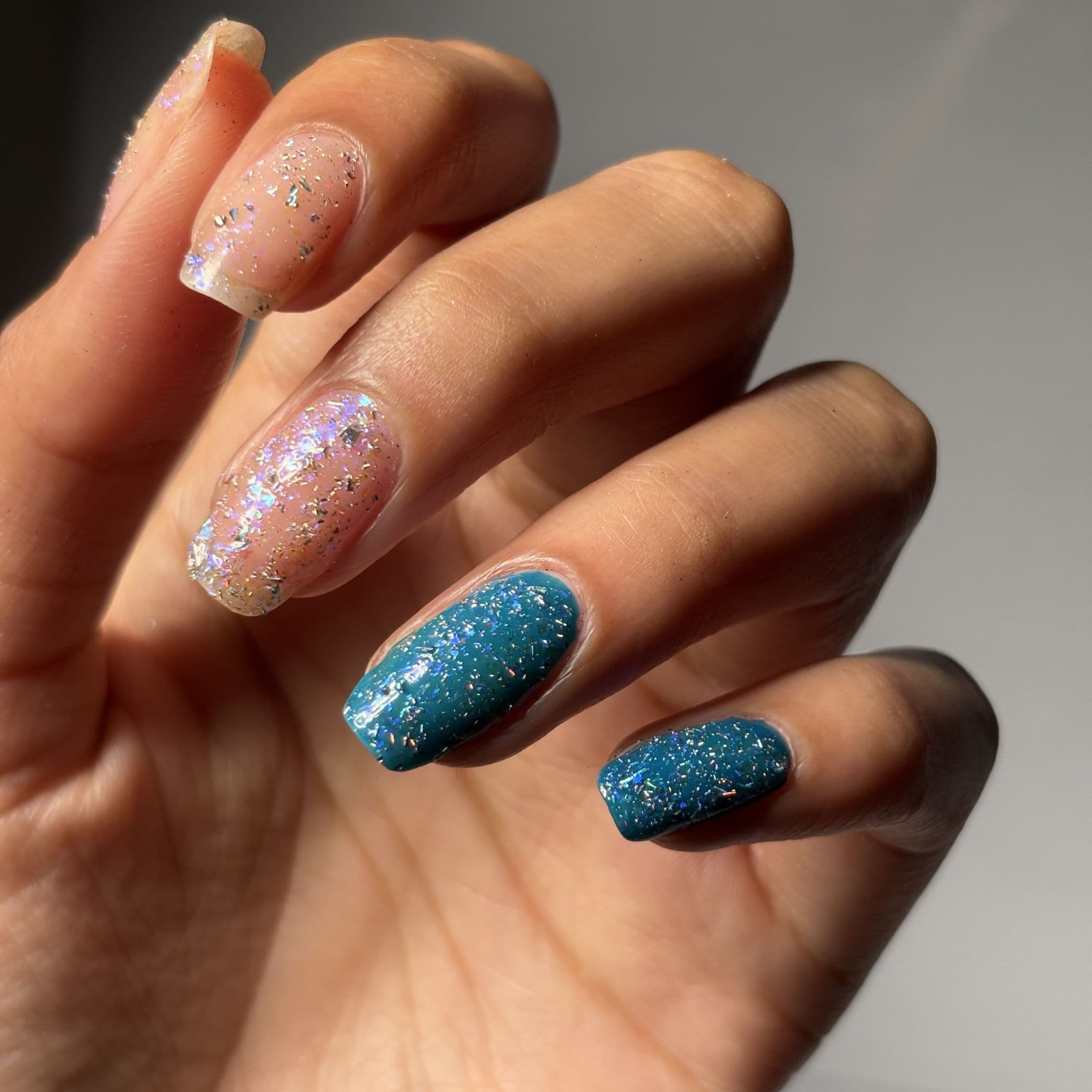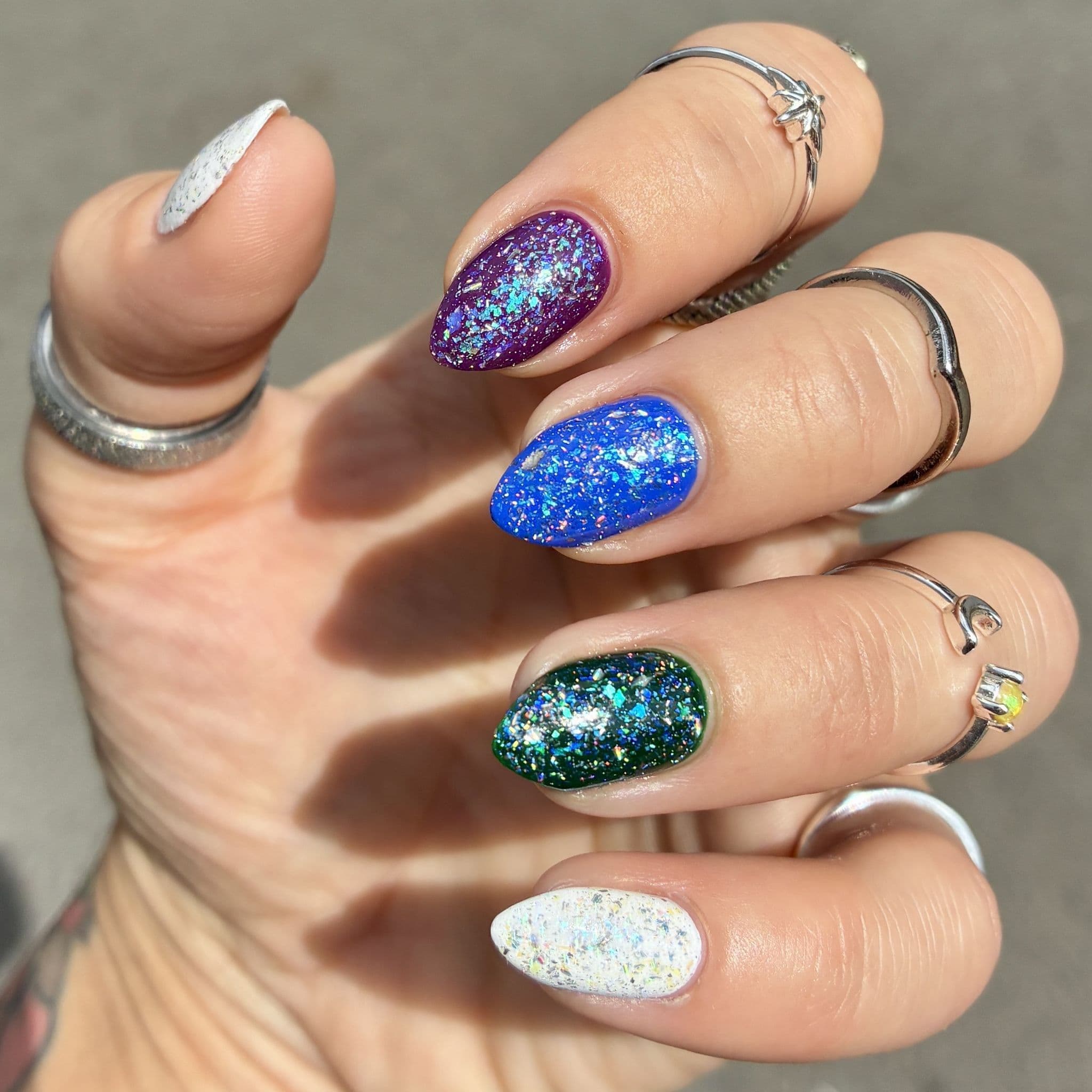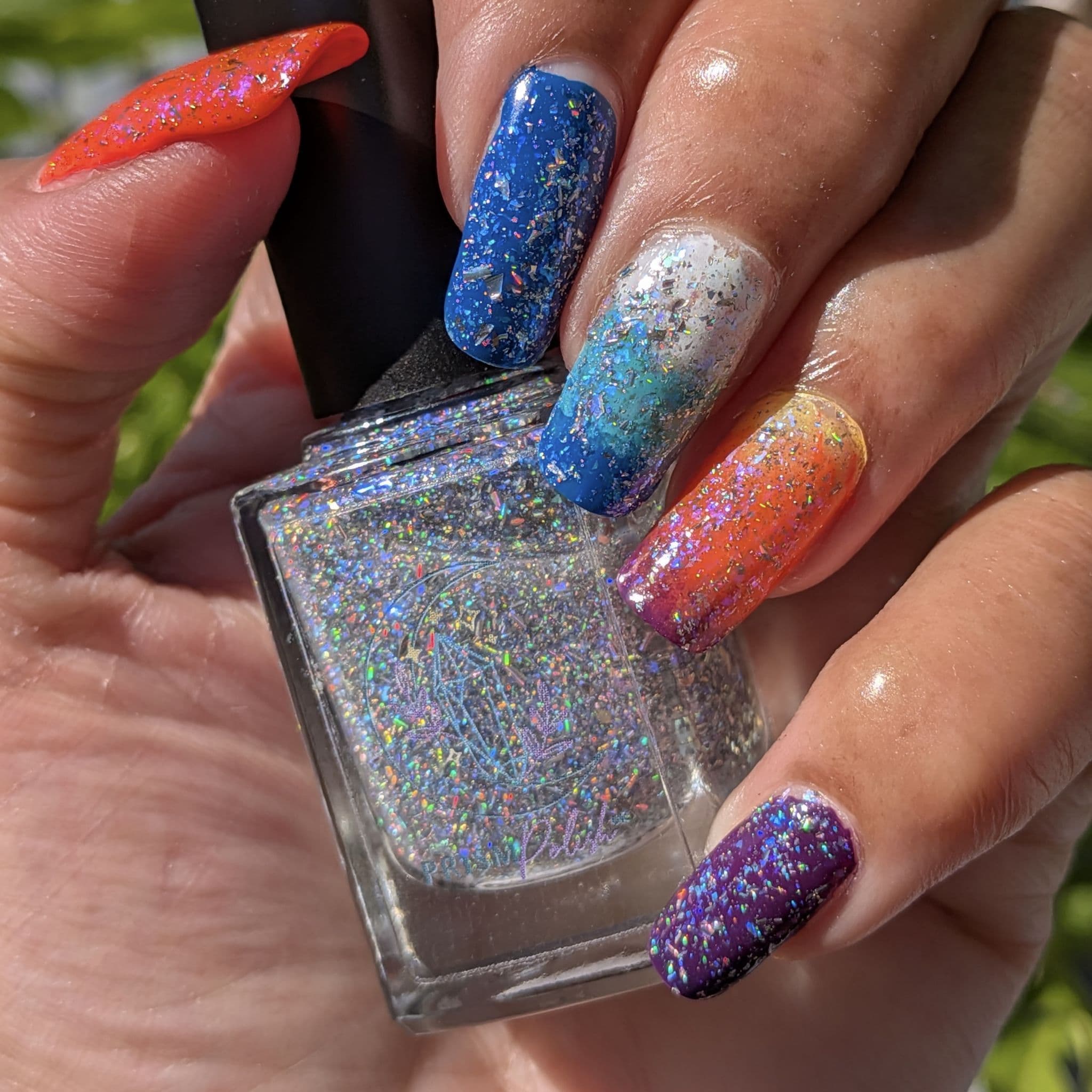 Named for the translucent Antarctic Icefish and originally released in the Summer of 2020 (cue lockdown flashbacks!) this turquoise/purple/blue shifting iridescent topper is also filled with holographic curls that look like bar glitter to add some extra sparkle to any mani!