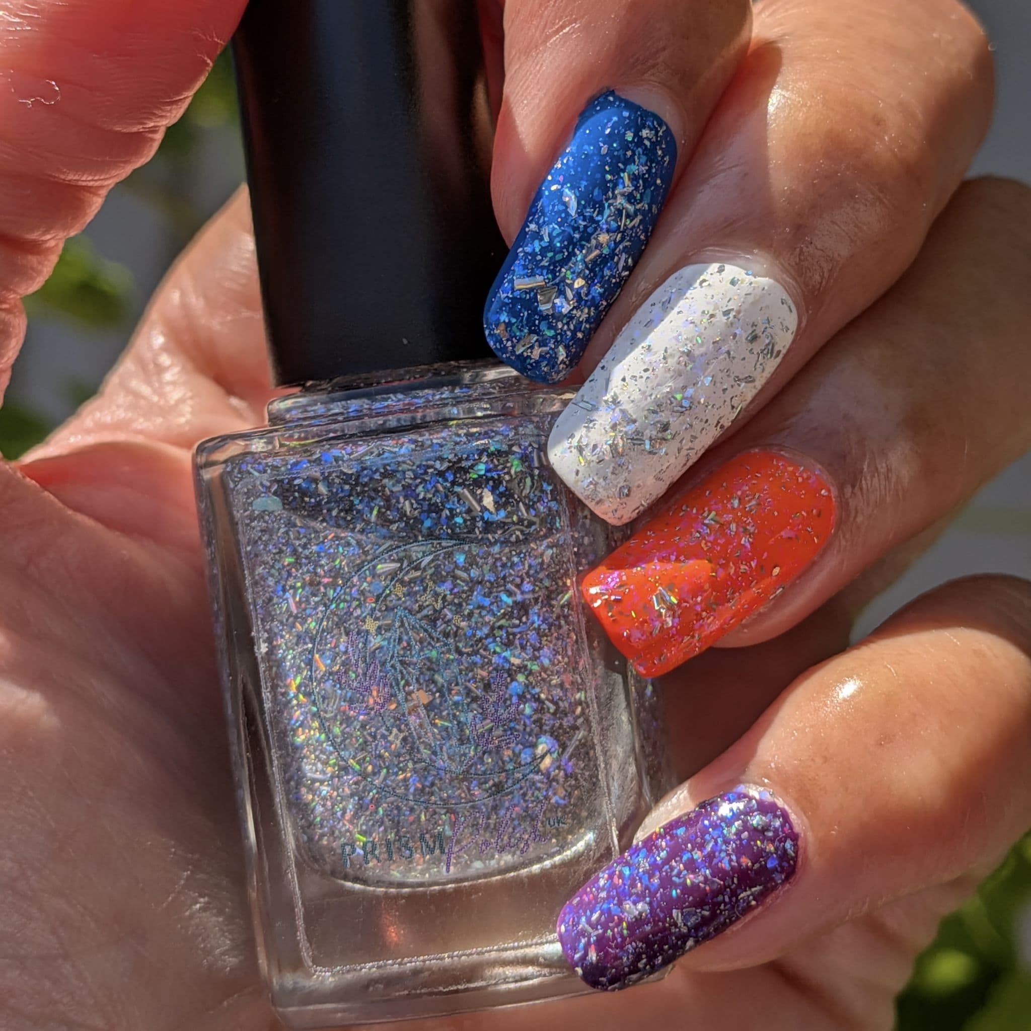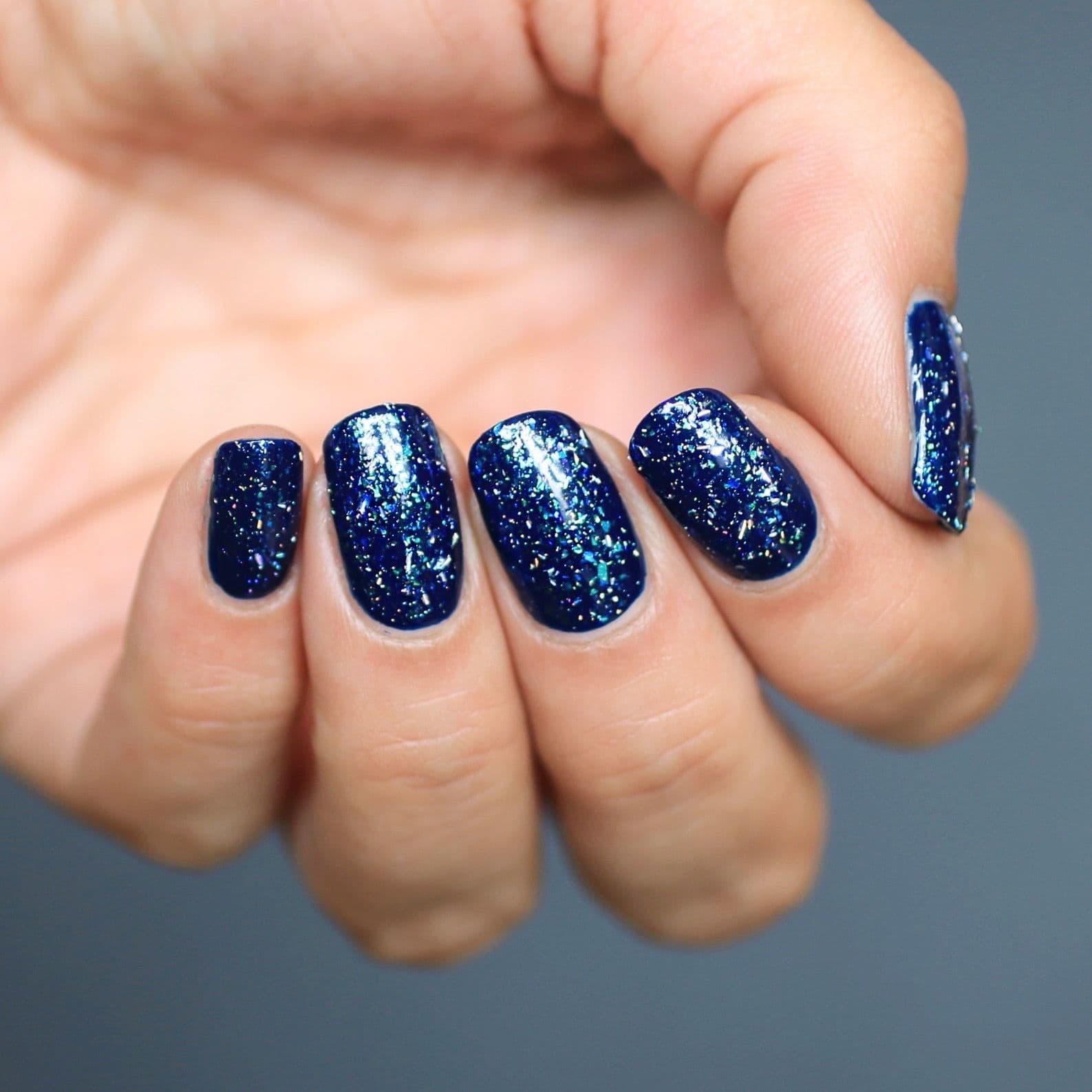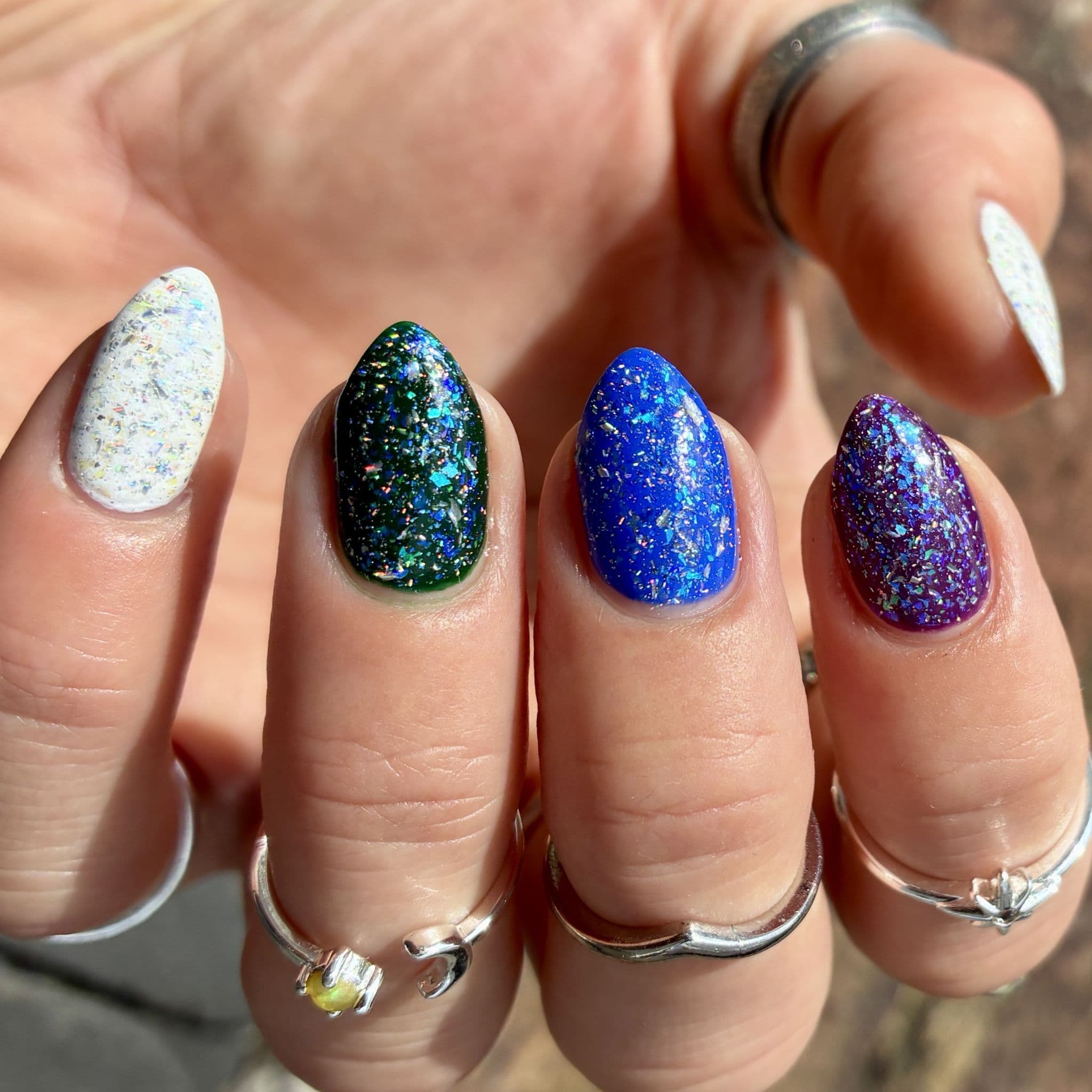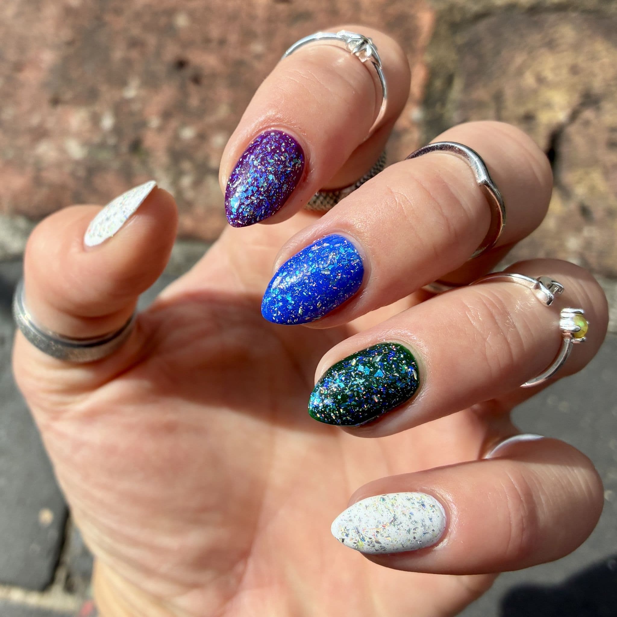 Designed to be used as a topper polish, this polish will take many coats to achieve opacity. Images show Icefish on its own, over black creme Vacuity and over blurple creme Loreto.