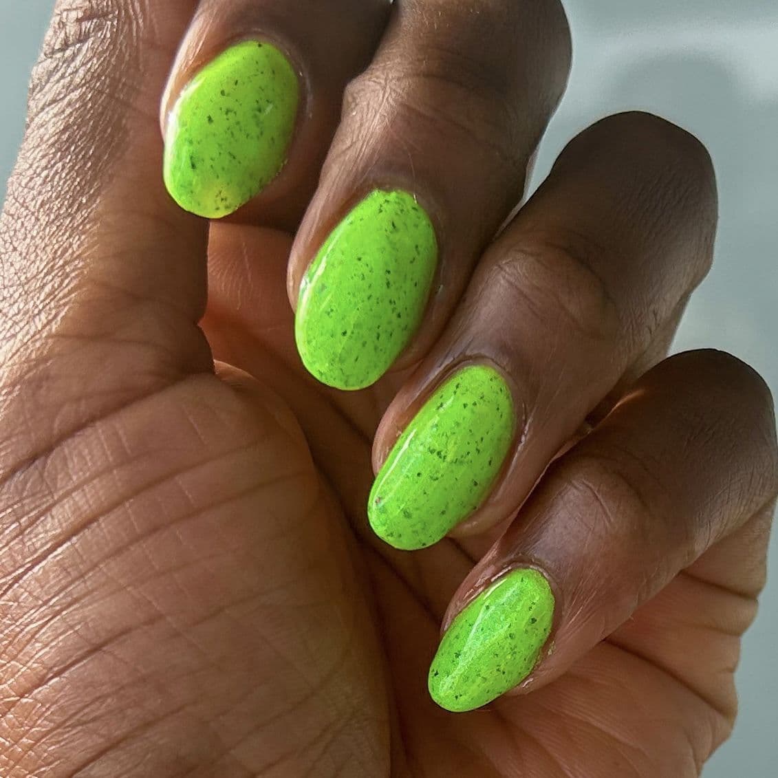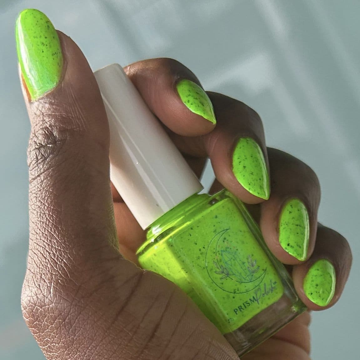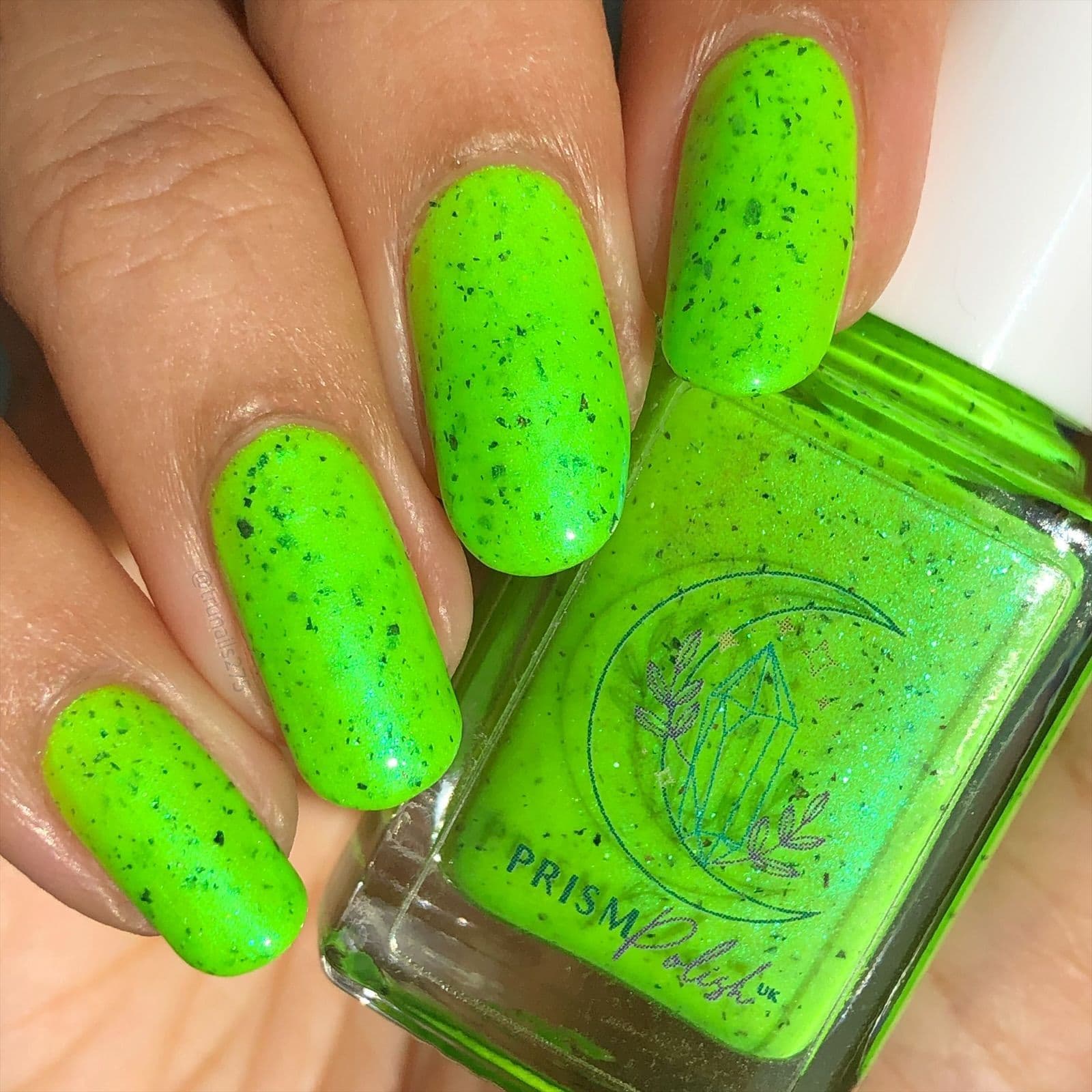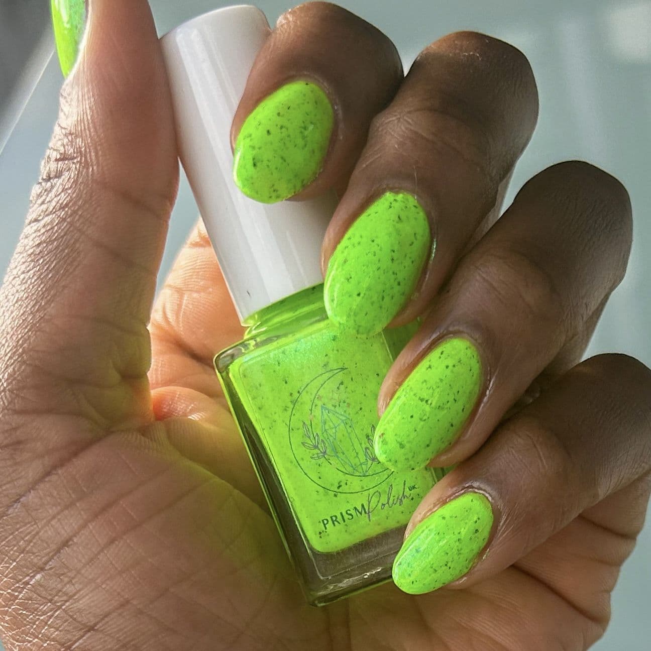 Electrify your nails with 'Life finds a way', a bold neon lime polish that pay tribute to the unstoppable force of nature in Jurassic Park. This vibrant, eye-searing shade glows with vivid green shimmer and is speckled with black and red shifting microflakies - like prehistoric DNA brought back to life and bottled. This polish captures the chaos and brilliance of evolution in every swipe of the brush. A classic Prism-style shade, 'Life finds a way' delivers an intense pop of colour that refuses to be ignored.