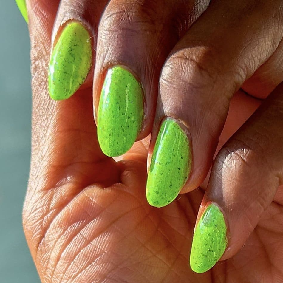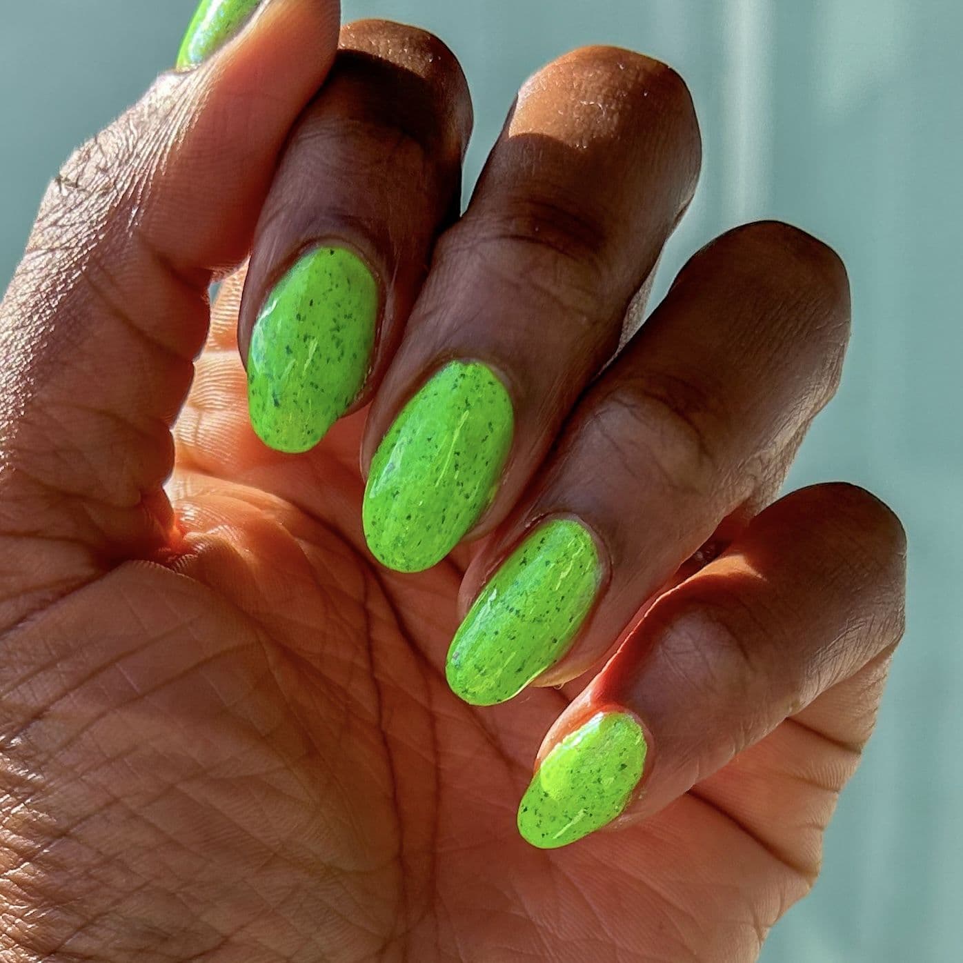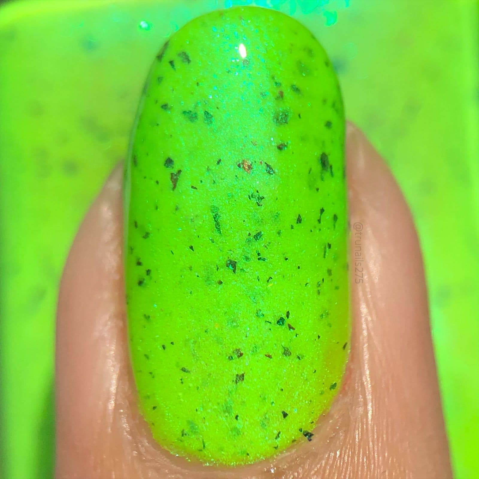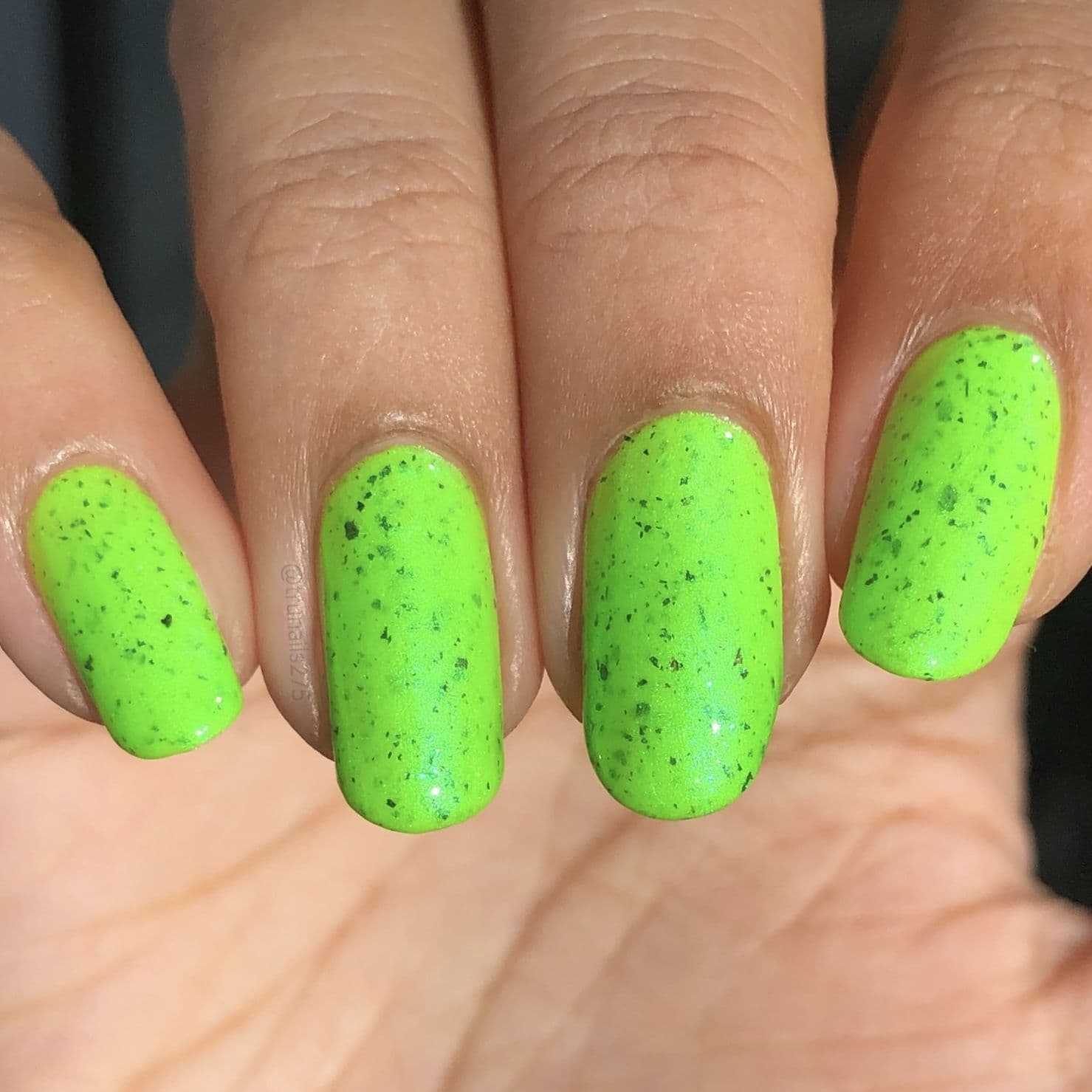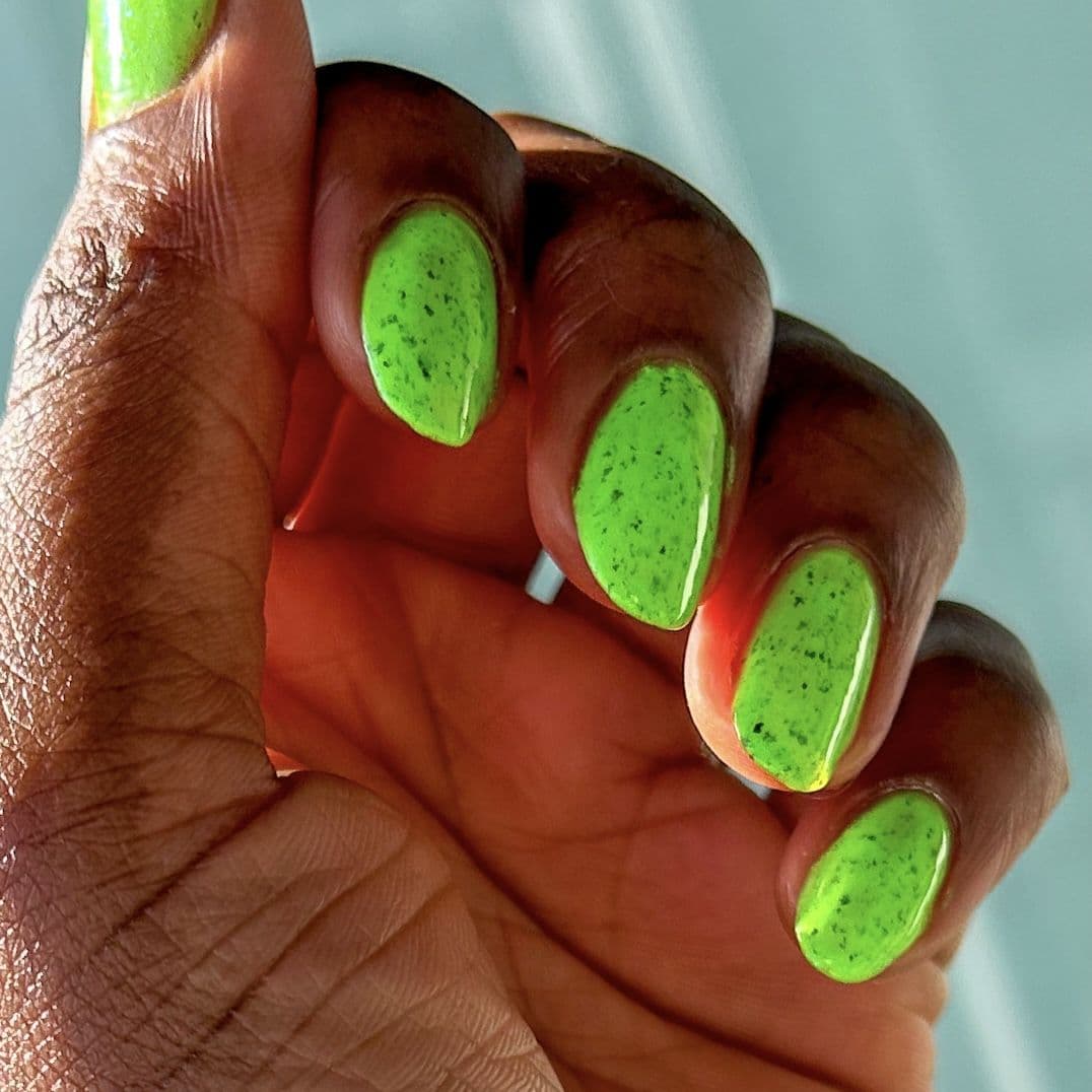 Electrify your nails with 'Life finds a way', a bold neon lime polish that pay tribute to the unstoppable force of nature in Jurassic Park. This vibrant, eye-searing shade glows with vivid green shimmer and is speckled with black and red shifting microflakies - like prehistoric DNA brought back to life and bottled. This polish captures the chaos and brilliance of evolution in every swipe of the brush. A classic Prism-style shade, 'Life finds a way' delivers an intense pop of colour that refuses to be ignored.