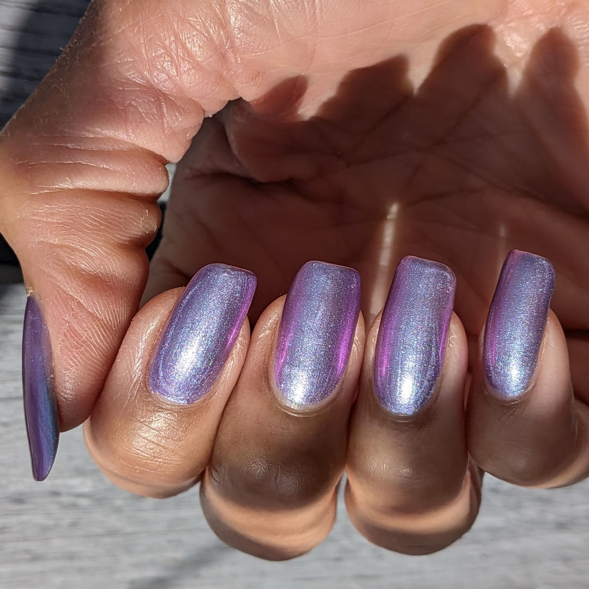 Step into the mysterious world of dreams with Purple’s Cool, a nail polish inspired by the timeless allure of the Twilight saga. This enchanting shade features a soft lilac base kissed with a pearly multichrome shimmer that shifts blue/green/violet, echoing the magic of moonlit meadows and otherworldly romance.